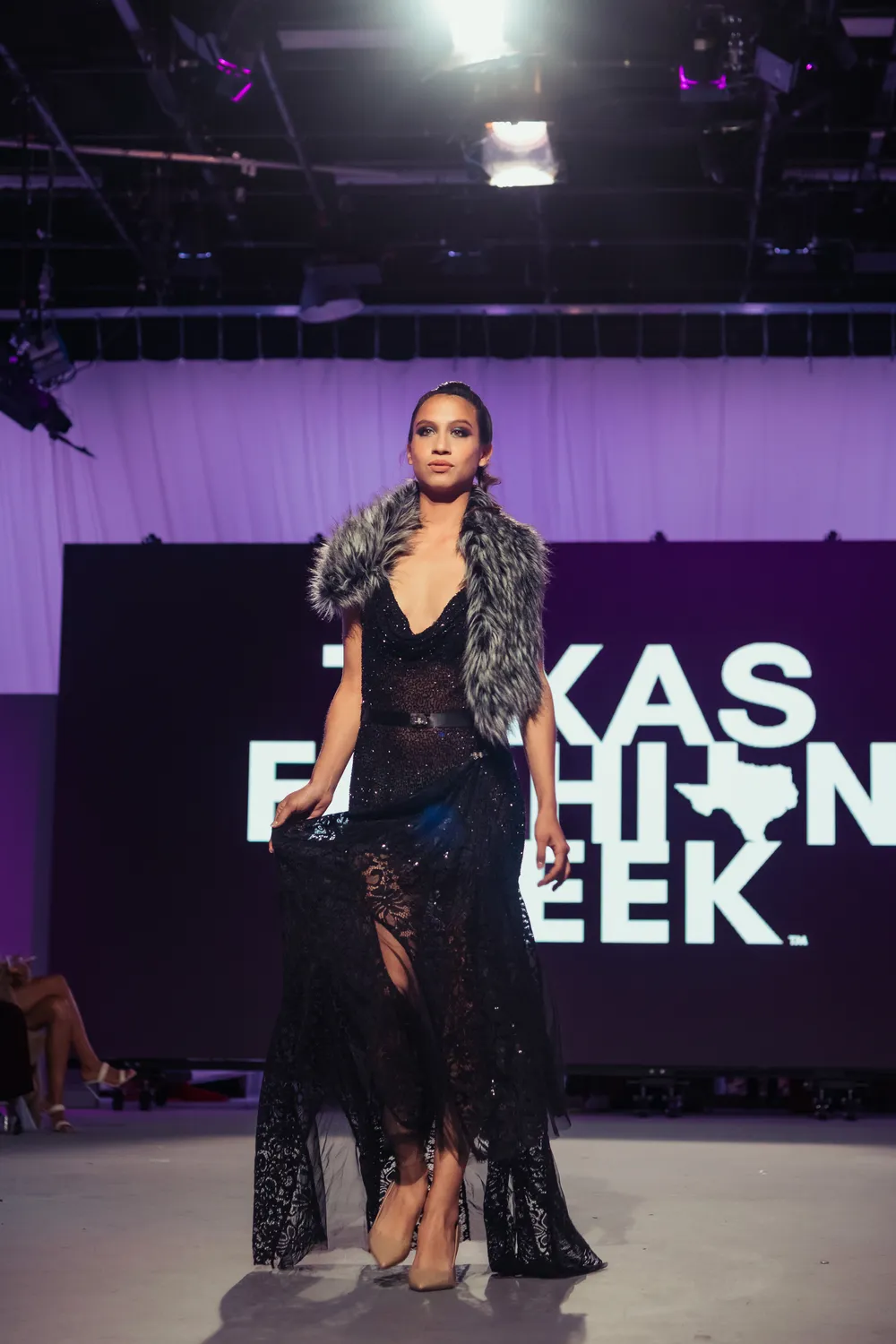 Black Sequin & Lace Gown with Faux Fur Collar