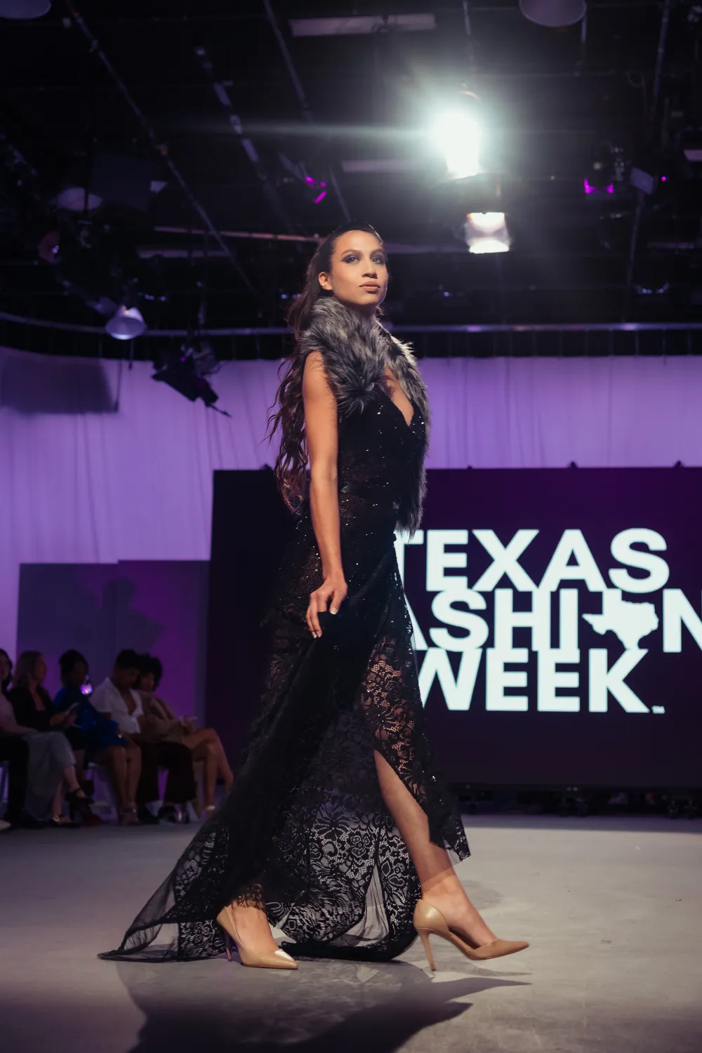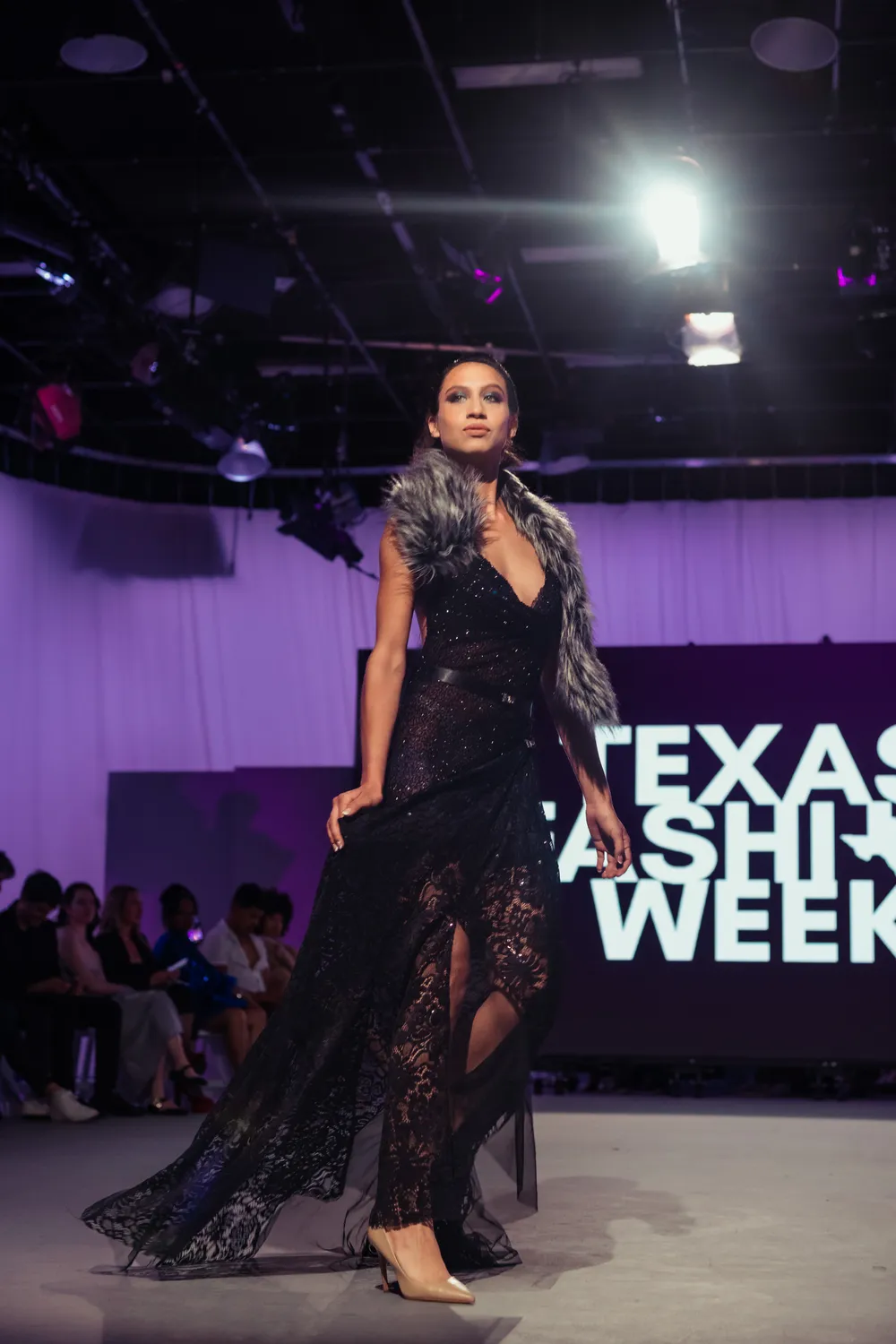 Unapologetically powerful and endlessly elegant, this full-length black couture gown made its dramatic debut at Texas Fashion Week, embodying high fashion with an edge. Crafted from a rich blend of hand-sequined lace and stretch satin, this design was created to command attention from the first step onto the runway.