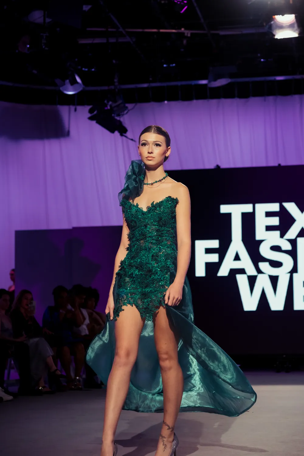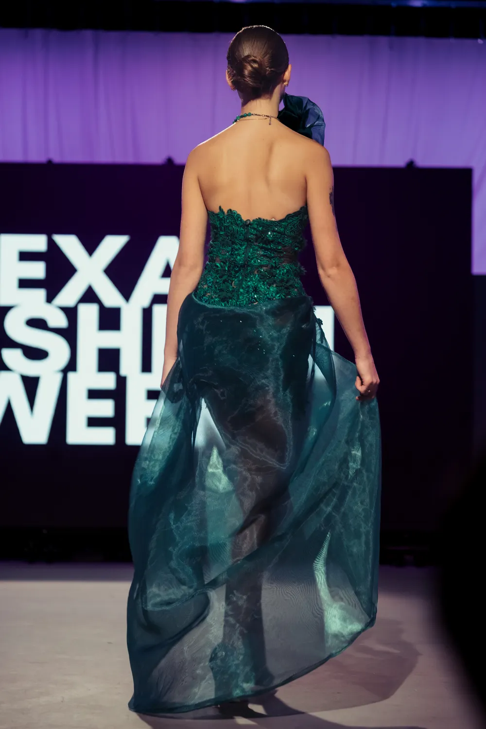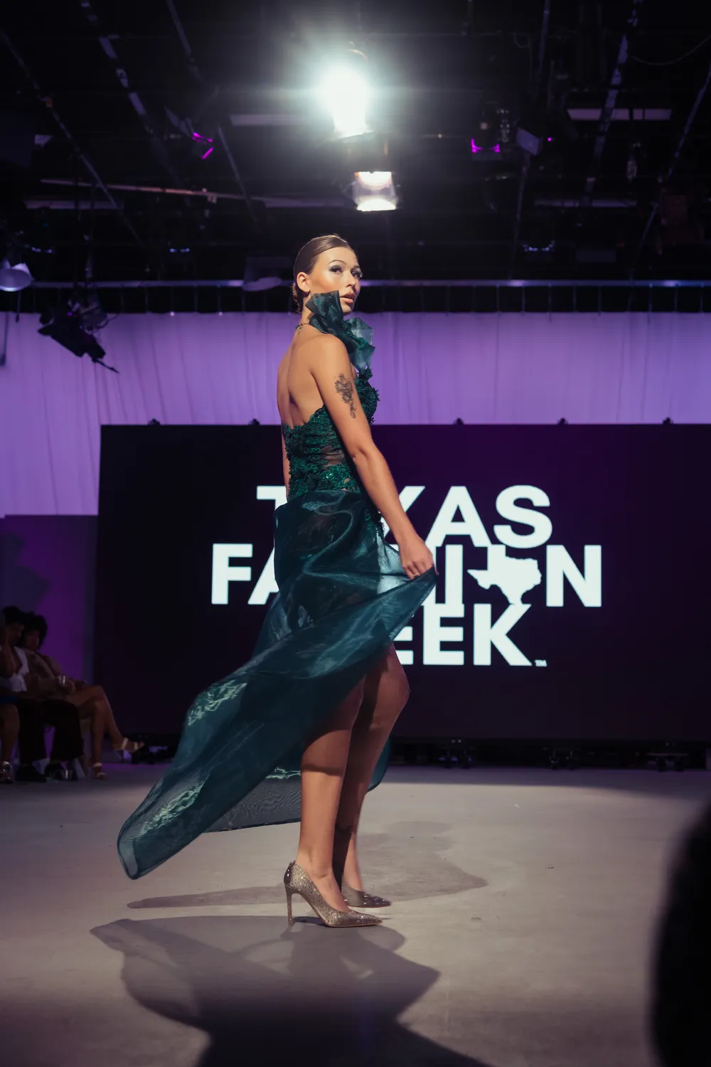 Commanding and couture, this sculptural emerald green gown electrified the runway at Texas Fashion Week with its daring silhouette and decadent details. Designed for the confident muse, this piece fuses sheer artistry with fierce femininity.